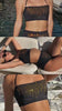 The structured bodice features unwired cups and a contemporary square neckline for a contoured fit. A cinching belt enhances the waistline, creating a refined hourglass shape, while the high-cut leg elongates the silhouette. Each piece is adorned with hand-applied topaz gold crystals that shimmer against the jet-black fabric, evoking the glow of city lights.